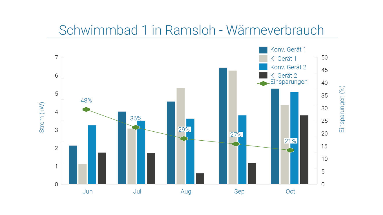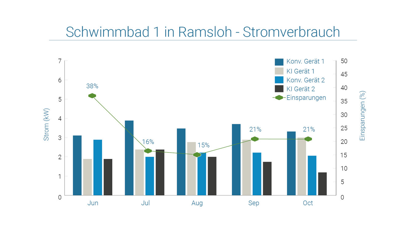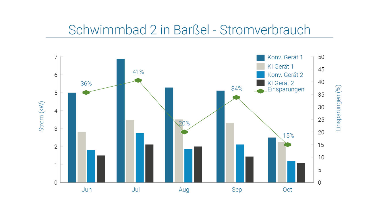 Zwei weitere Schwimmbäder wurden hinsichtlich des etaSmart Einsparpotenzials untersucht. Über ein Jahr wurden im täglichen Wechsel die Lüftungsgeräte mit und ohne KI betrieben. Beide Schwimmbäder sind mit jeweils einem Entfeuchtungsgerät für den Badbereich ausgestattet, ohne integrierte Wärmepumpe. Das Gerät in Bad Zwischenahn hat eine Luftleistung von 16.000 m³/h, das in Steinfeld 12.000 m³/h. In Steinfeld ist das Bad im Sommer sogar außer Betrieb. In Bad Zwischenahn sorgt die KI dafür, dass zwar mehr Wärmeleistung benötigt wird, dafür aber der Stromverbrauch überproportional sinkt mit dann reduzierten Gesamtkosten von 31%. Die höheren Temperaturen im Bad sorgen dann auch dafür, dass die Verdunstungsverluste des Beckenwassers reduziert werden.