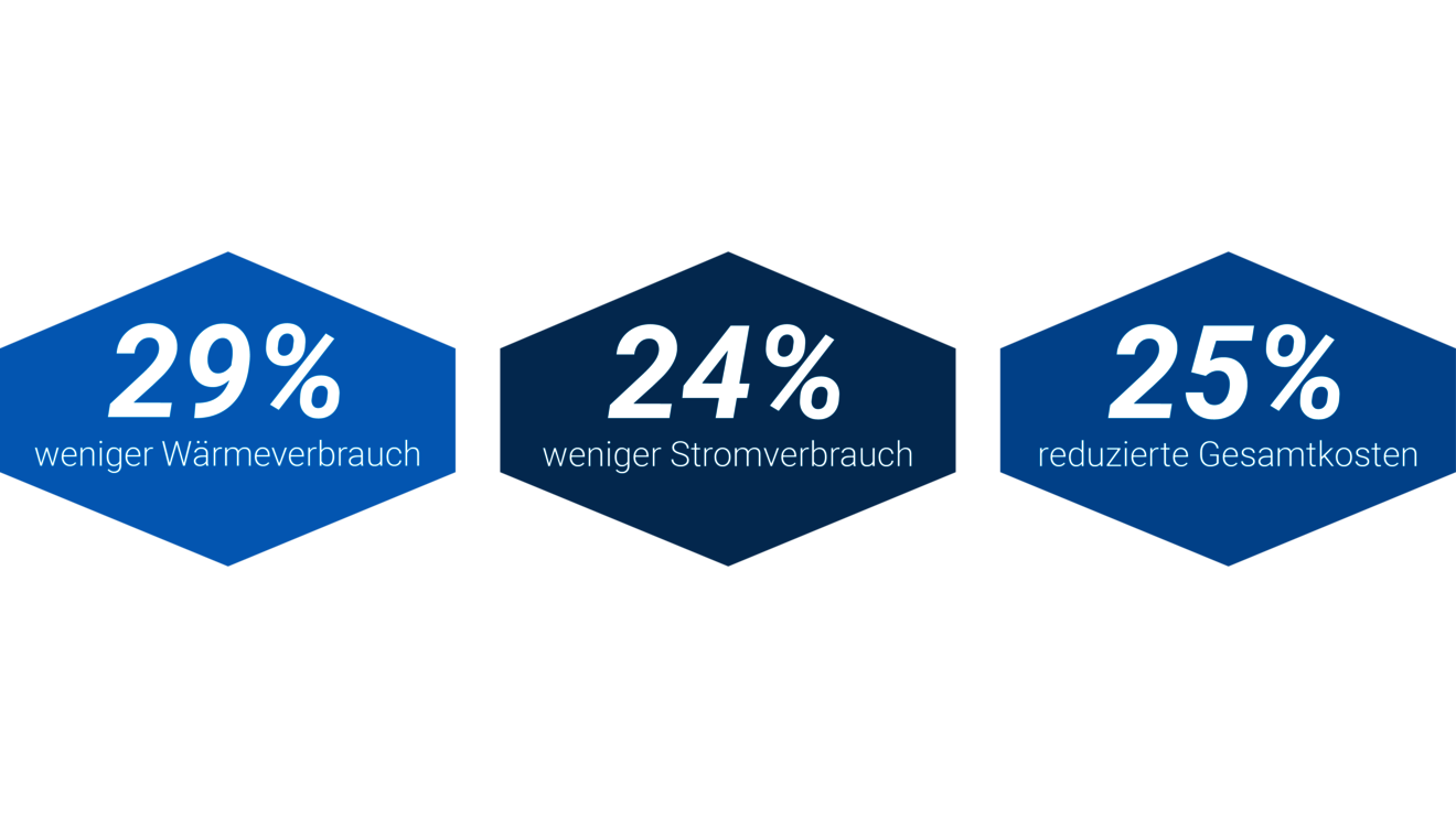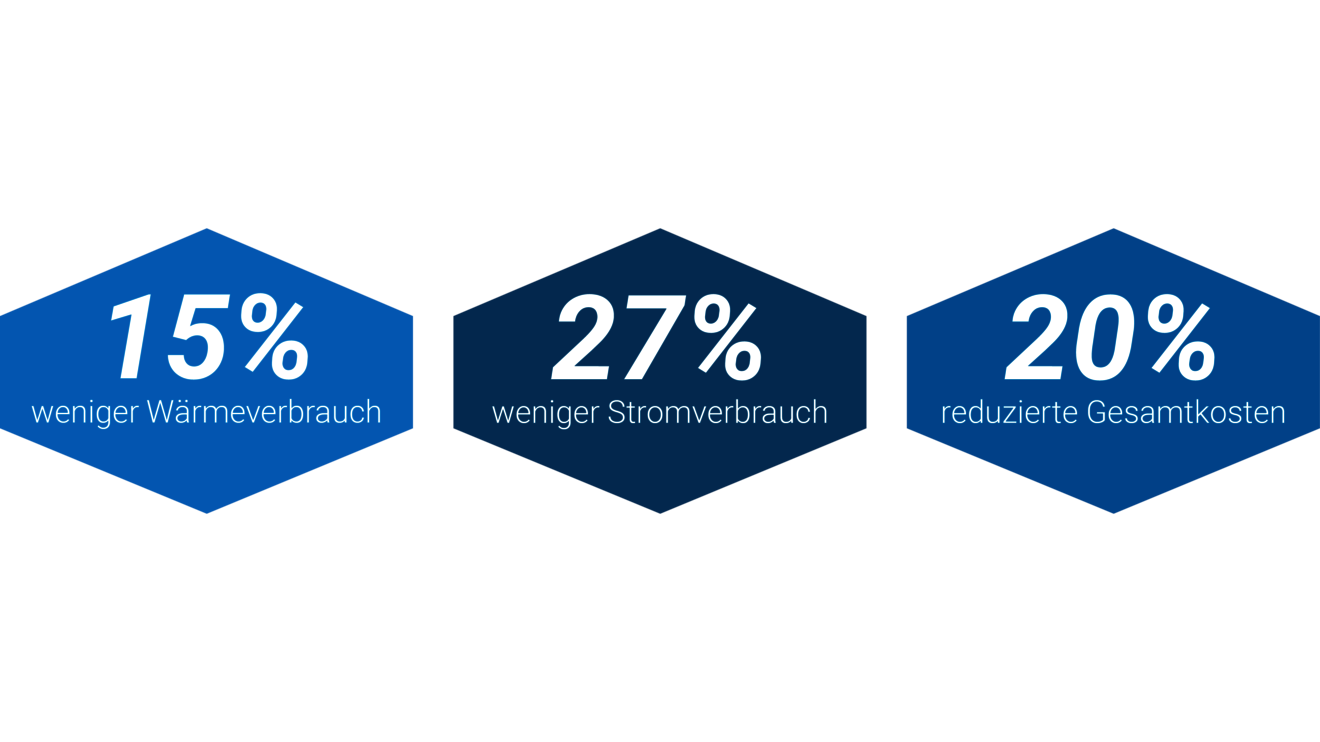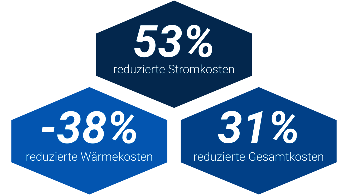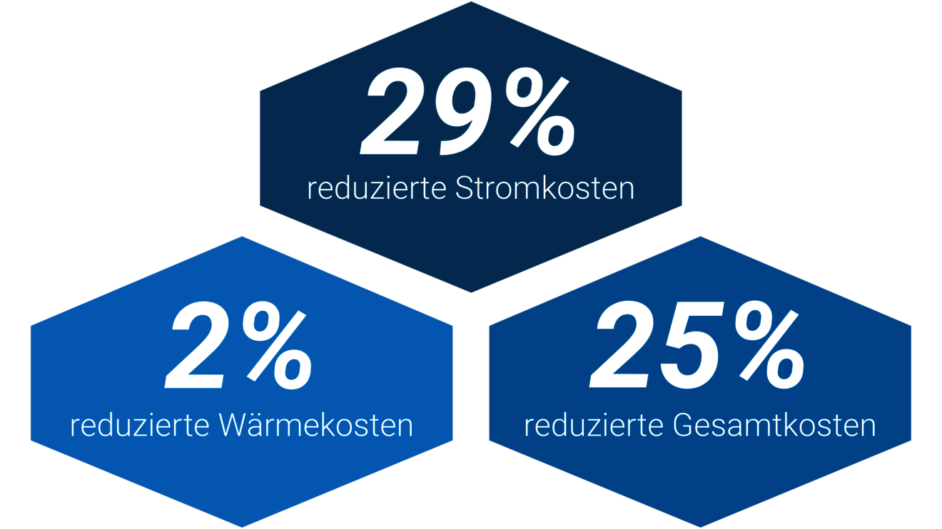 Wir haben den vergleichenden Betrieb über insgesamt 16 Monate durchgeführt und im Mittel 24% geringeren Stromverbrauch und 29% geringeren Wärmeverbrauch festgestellt. Dieses ergibt dann um 25% reduzierte Energiekosten und somit eine Ensparung von insgesamt 10.000€ bei Stromkosten von 40 ct/kWh und Wärmekosten von 16 ct/kWh